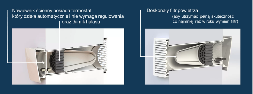 Oprócz usuwania zużytego powietrza z budynku musimy pamiętać o zapewnieniu stałego dopływu świeżego powietrza z zewnątrz. Dlatego nie wolno zapomnieć o instalacji odpowiednich nawiewników. W opisanym przypadku zdecydowaliśmy się na zastosowanie nawiewników Velco – to nawiewnik ścienny wyposażony w doskonały filtr powietrza, tłumik hałasu oraz termostatyczną głowicę reagującą automatycznie na zmiany temperatury na zewnątrz.
