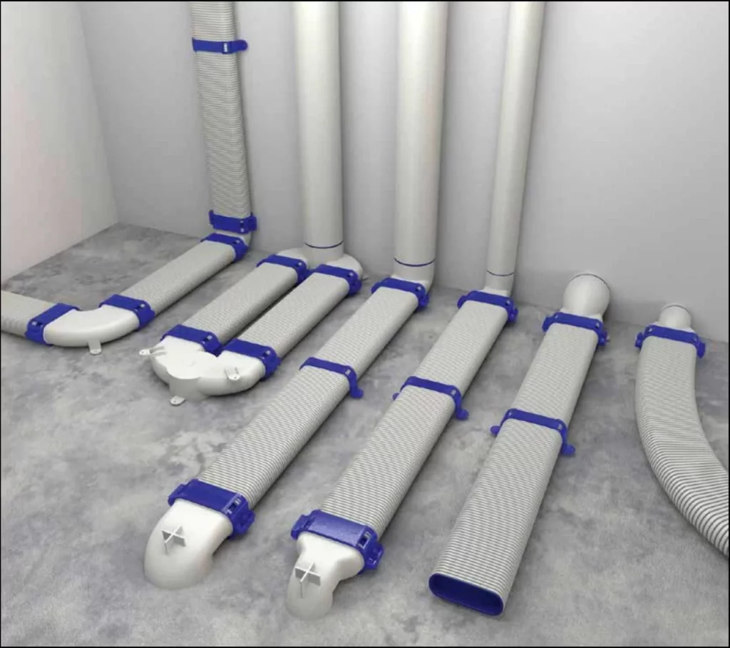 Easyflex wraz z kształtakimi oraz elementami mocującymi stanowi system przewodów wentylacyjnych gwarantujący przepływ powietrza, szczelność na całej dlugości przewodu oraz komfort akustyczny.