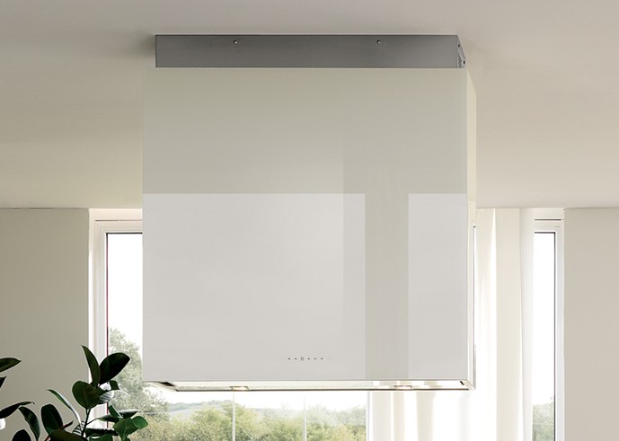Okap bezsilnikowy w wersji wyspowej, odpowiedni do połączenia z wentylatorem dachowym VILPE i działania w systemie Cichej Kuchni.