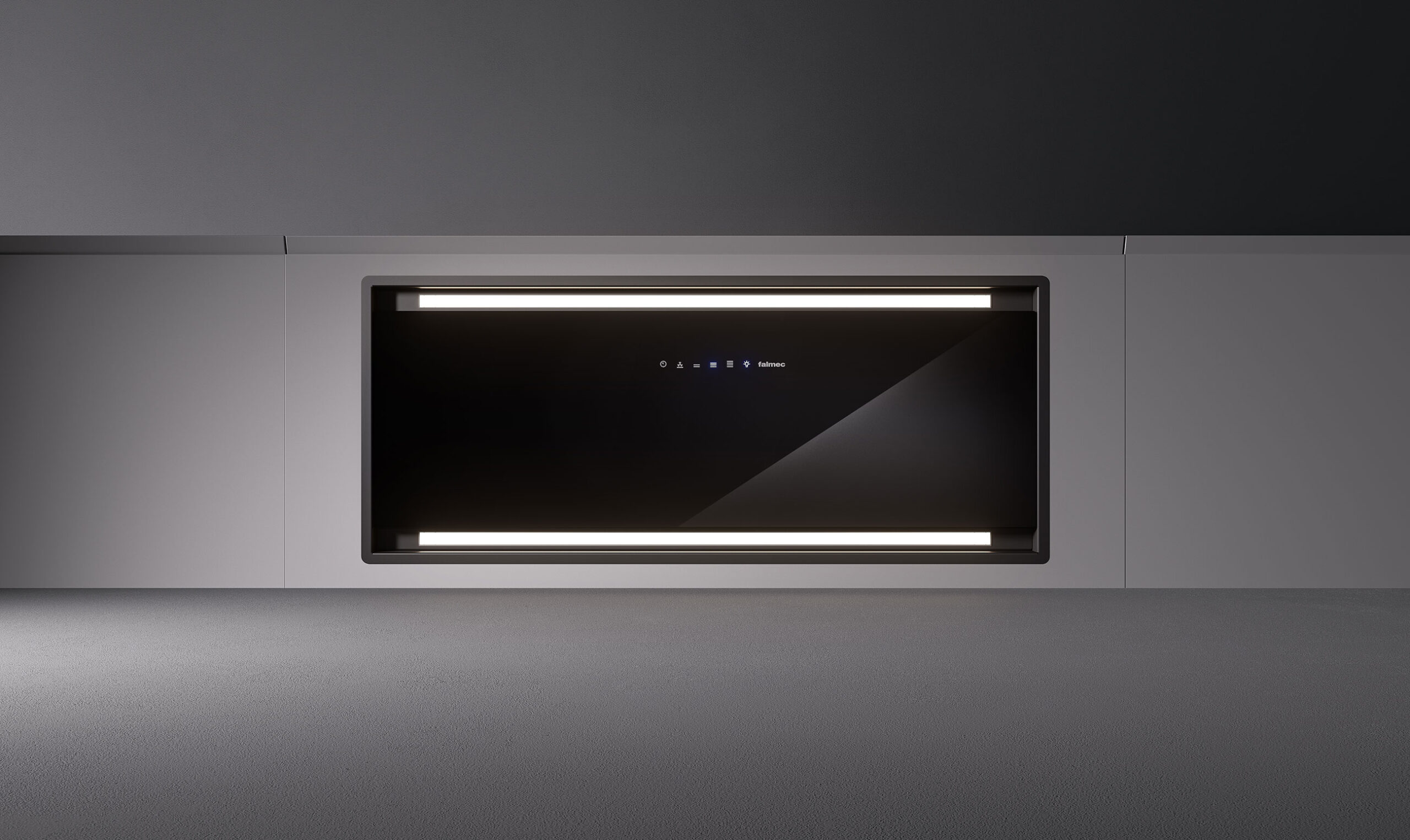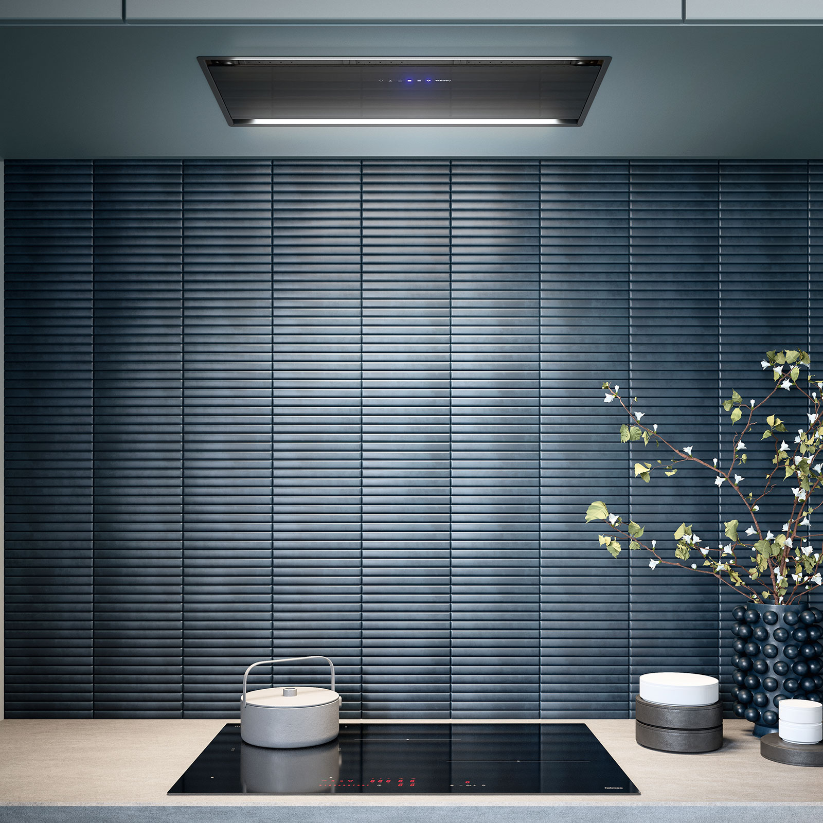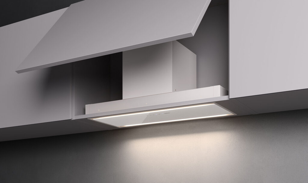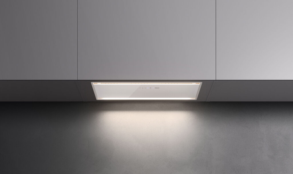 Okap podszafkowy w kolorze białym lub czarnym sterowanie sensorowe + pilot, Dialogue system z trybem automatycznym, oświetlenie LED z możliwością ściemniania, Dynamic LED Light.
