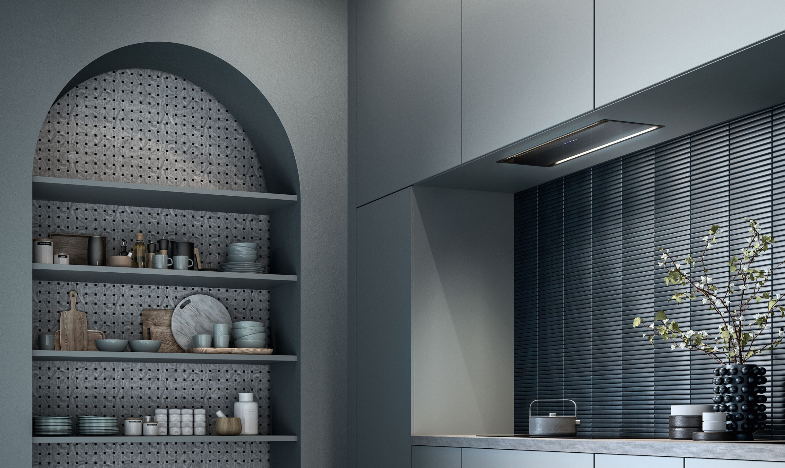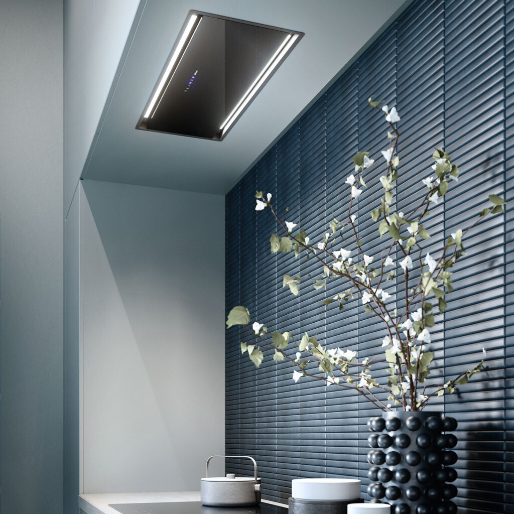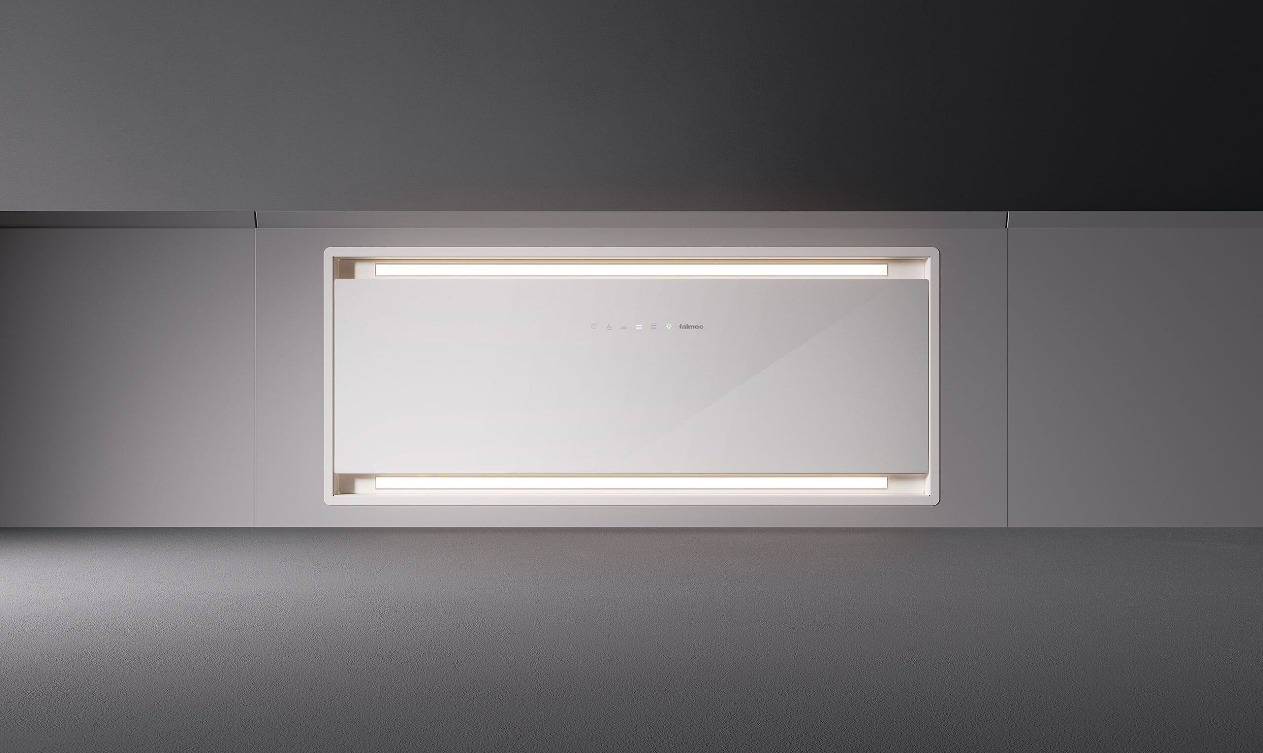 Okap podszafkowy w kolorze białym lub czarnym sterowanie sensorowe + pilot, Dialogue system z trybem automatycznym, oświetlenie LED z możliwością ściemniania, Dynamic LED Light.