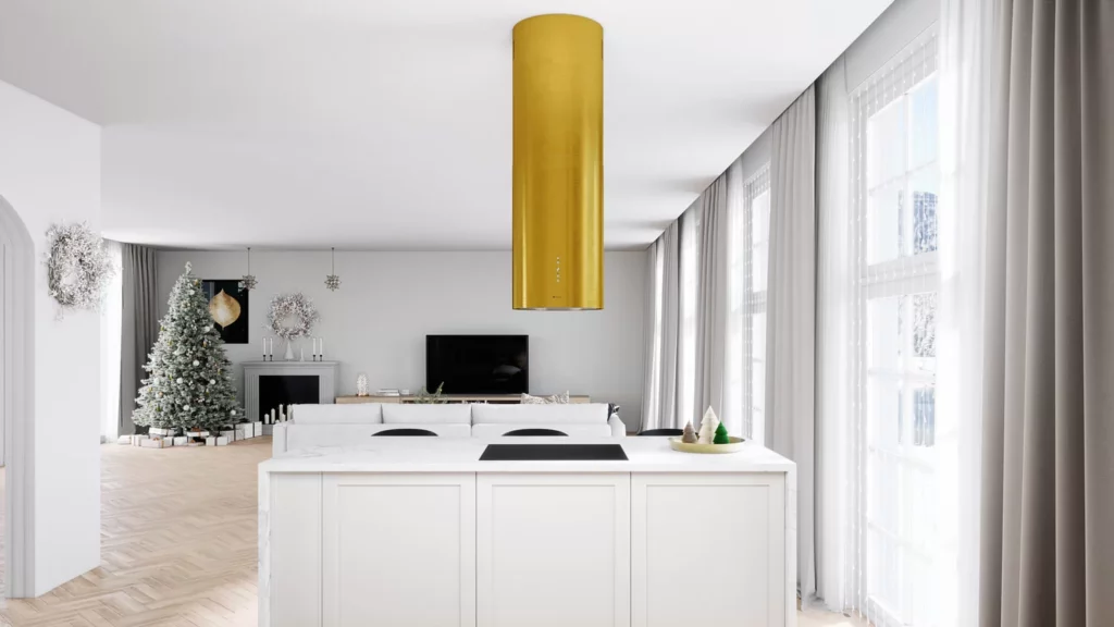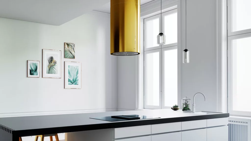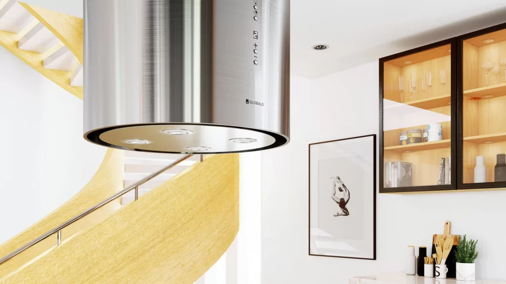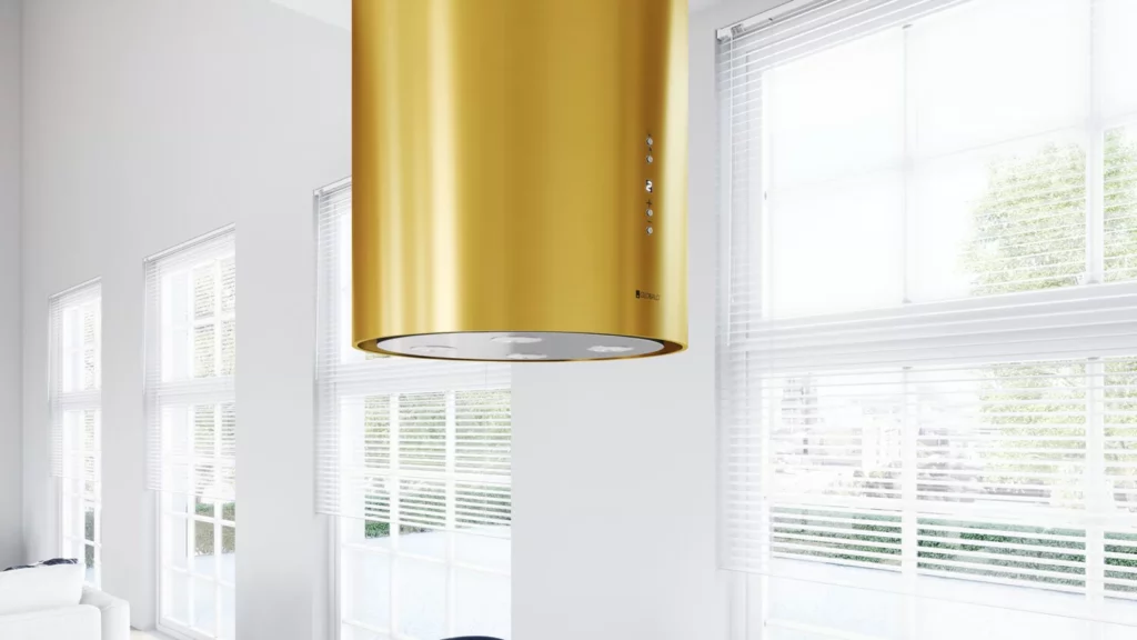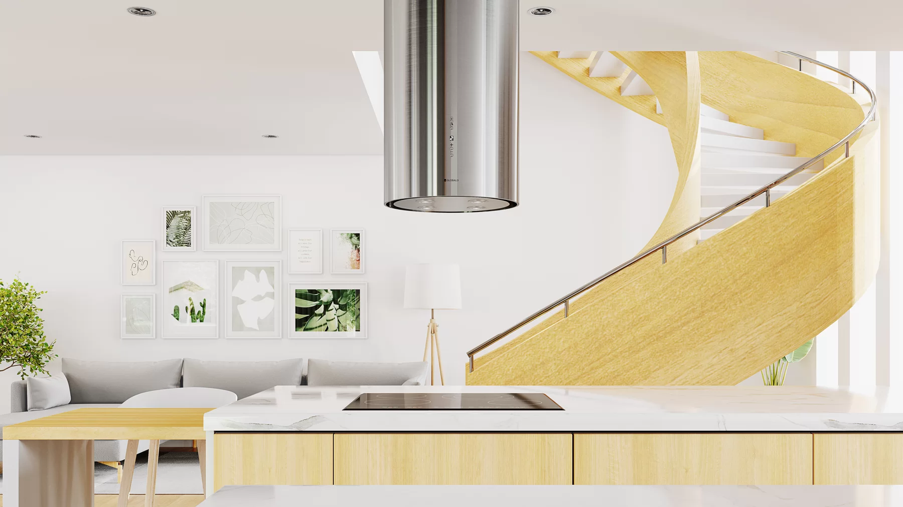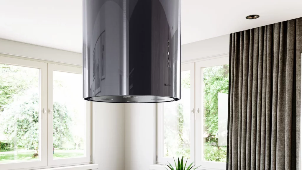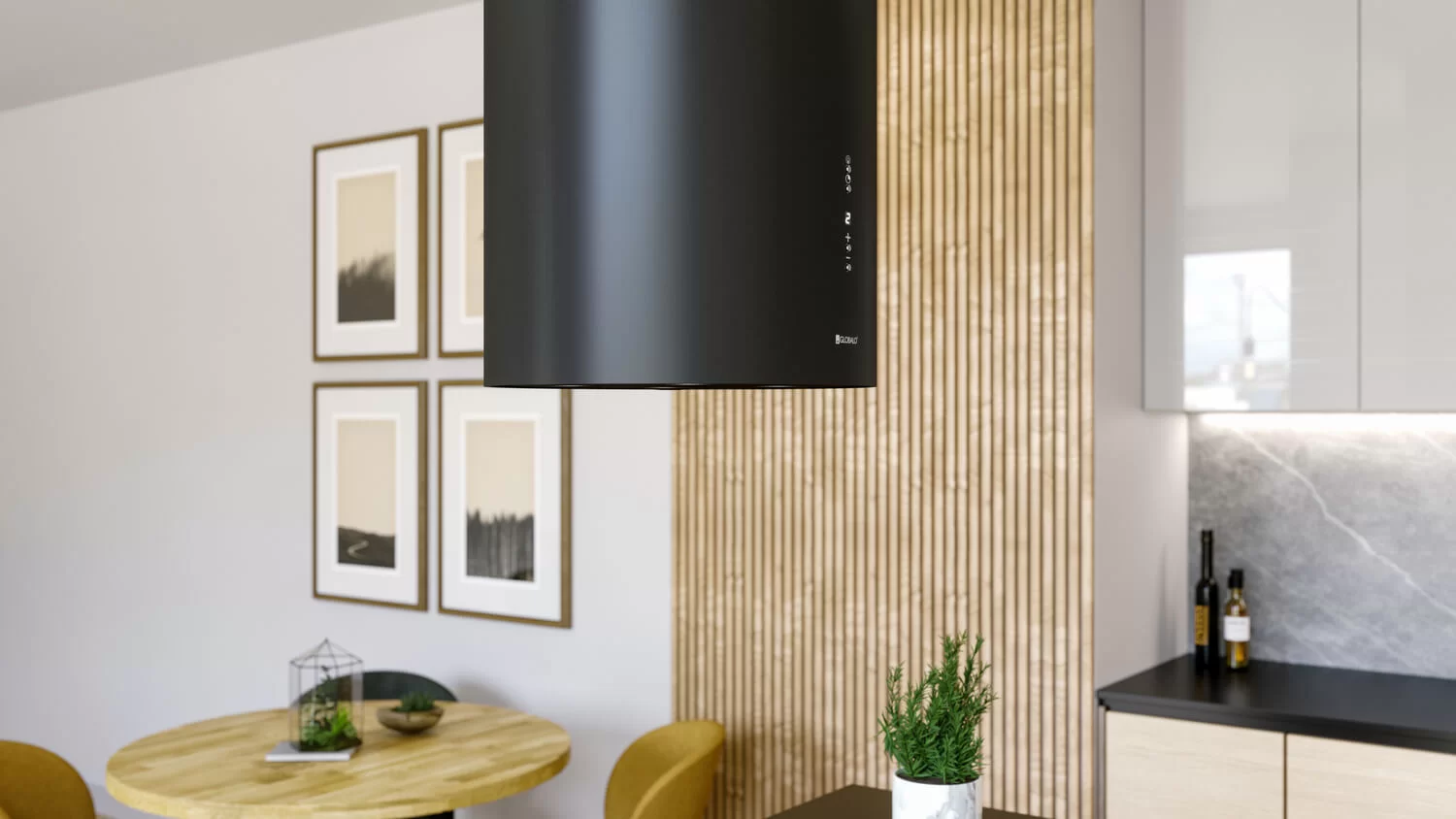 Okap bezsilnikowy w wersji wyspowej odpowiedni do połączenia z wentylatorem dachowym VILPE i działania w systemie Cichej Kuchni.