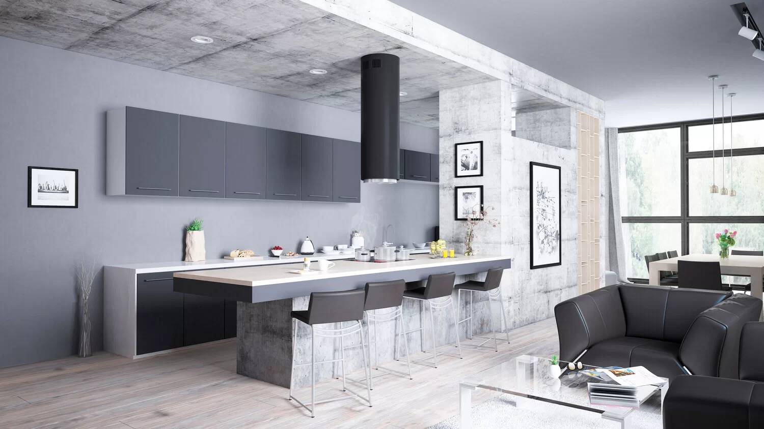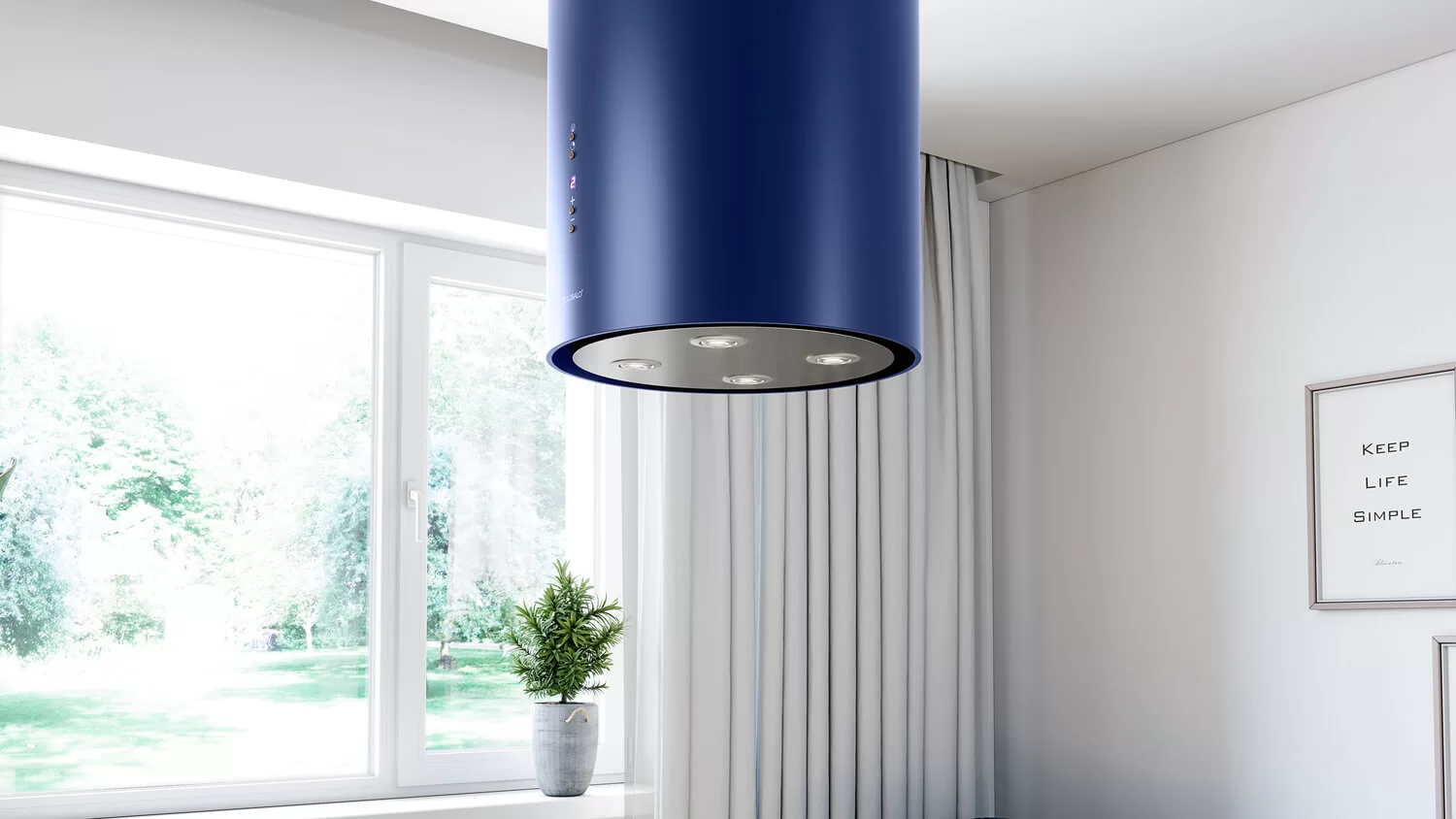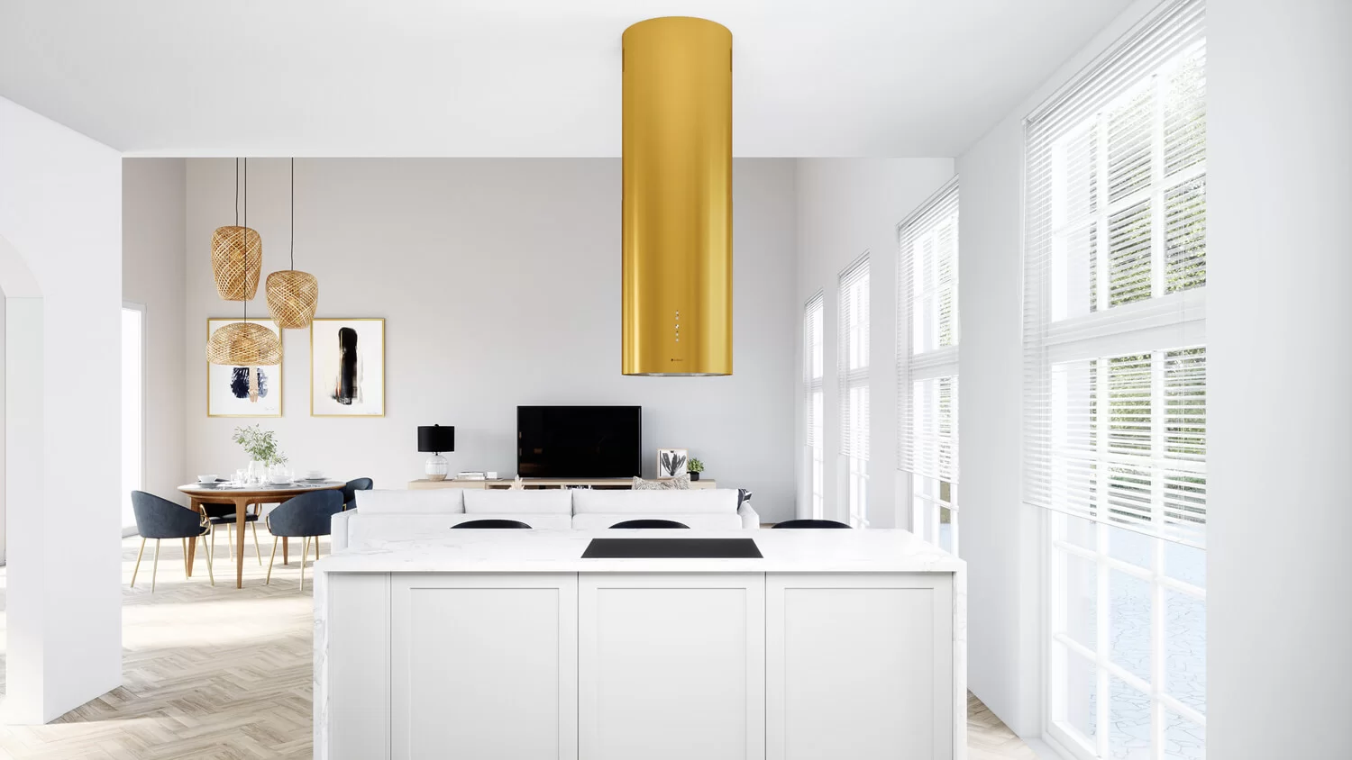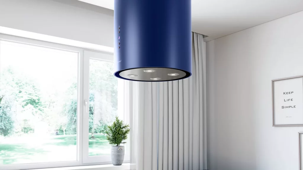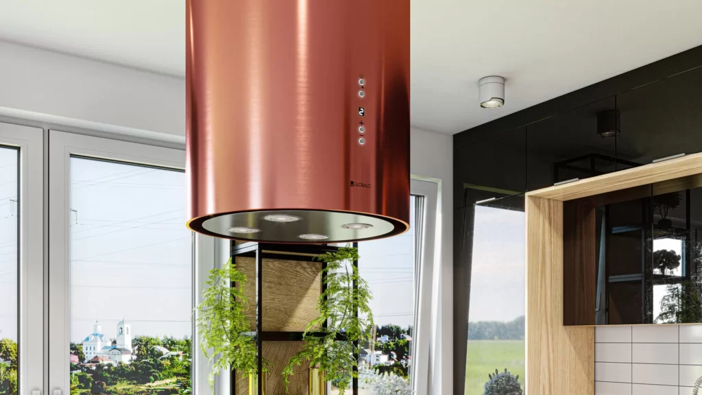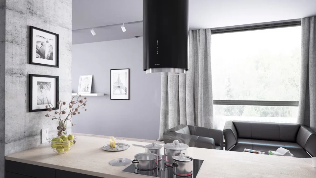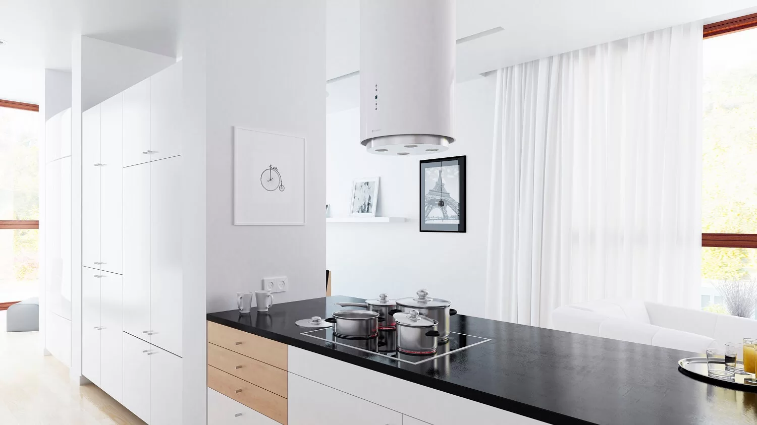 Okap bezsilnikowy w wersji wyspowej odpowiedni do połączenia z wentylatorem dachowym VILPE i działania w systemie Cichej Kuchni.