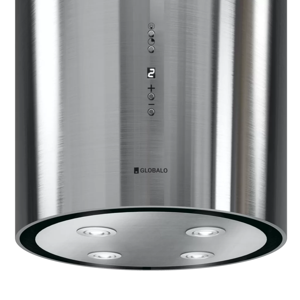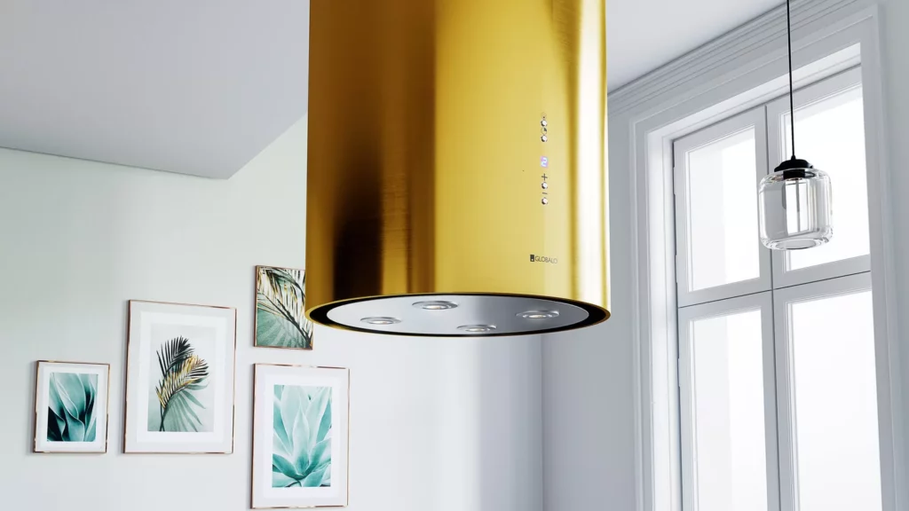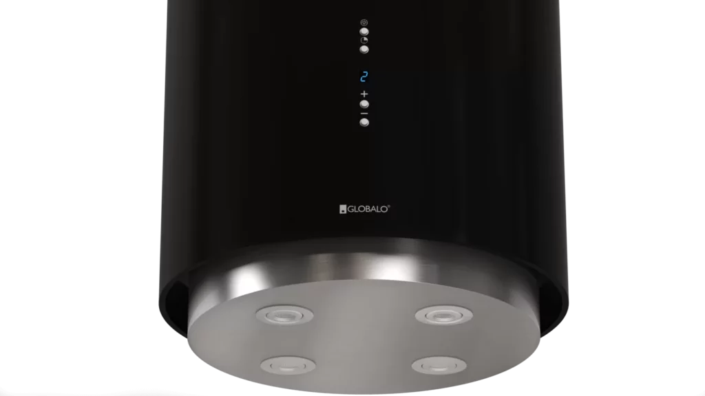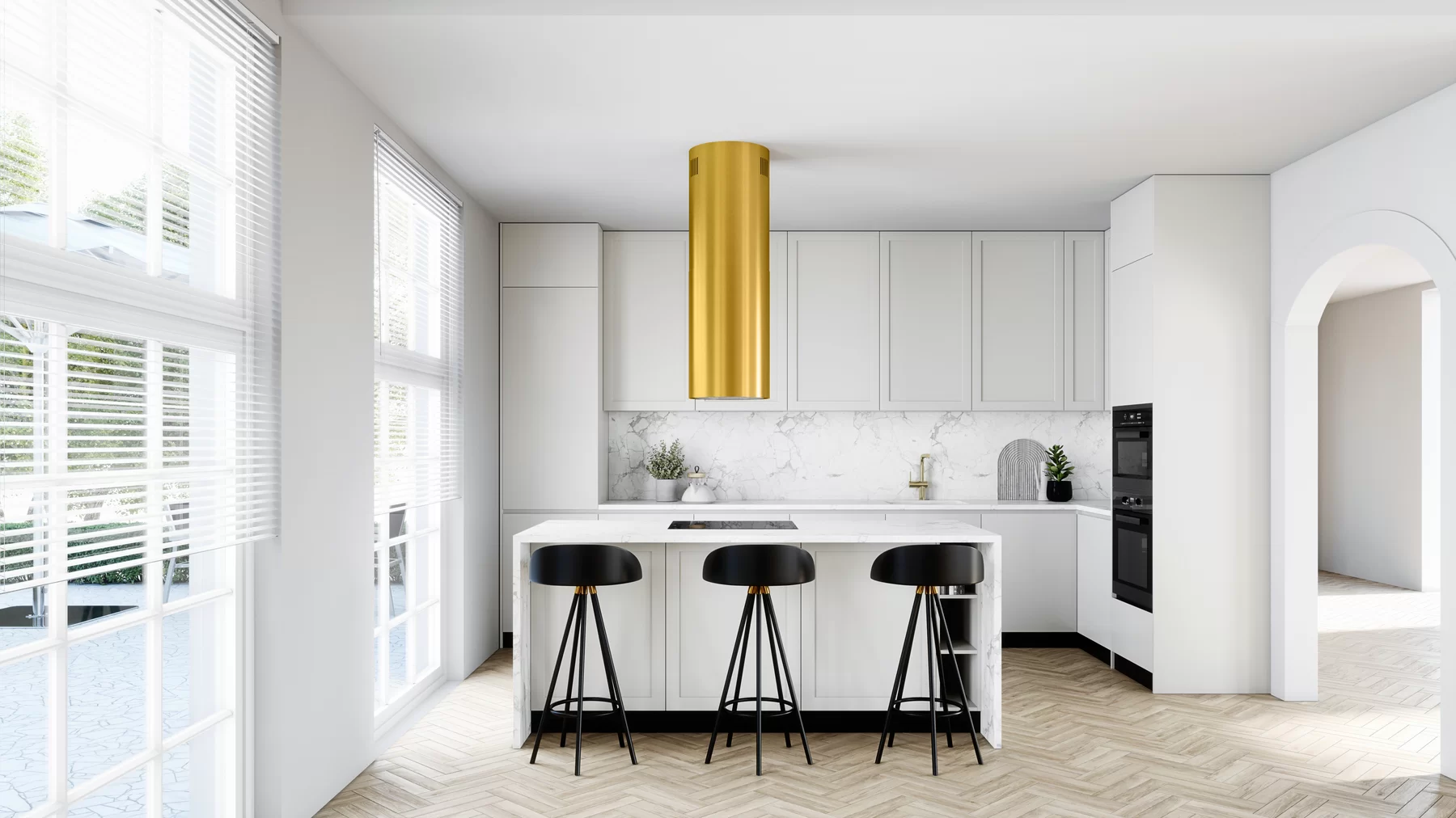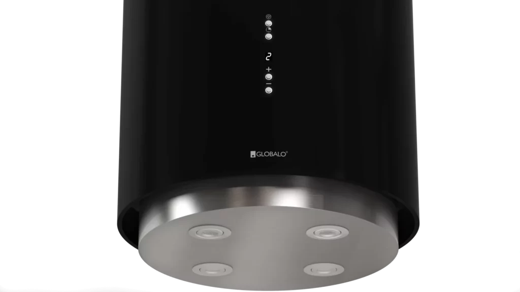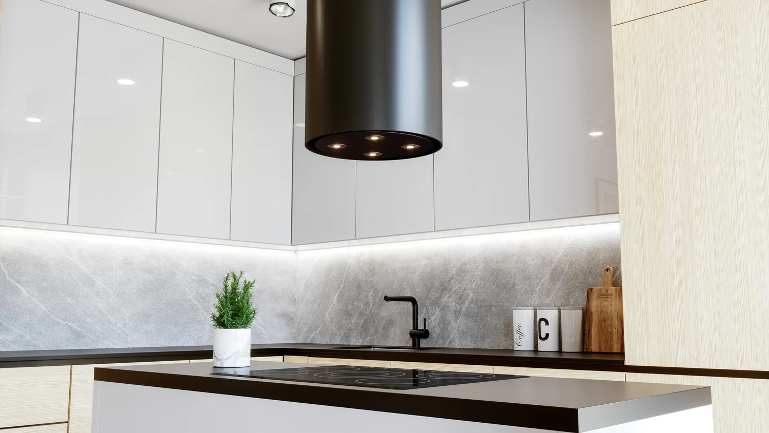 Okap bezsilnikowy w wersji wyspowej odpowiedni do połączenia z wentylatorem dachowym VILPE i działania w systemie Cichej Kuchni.