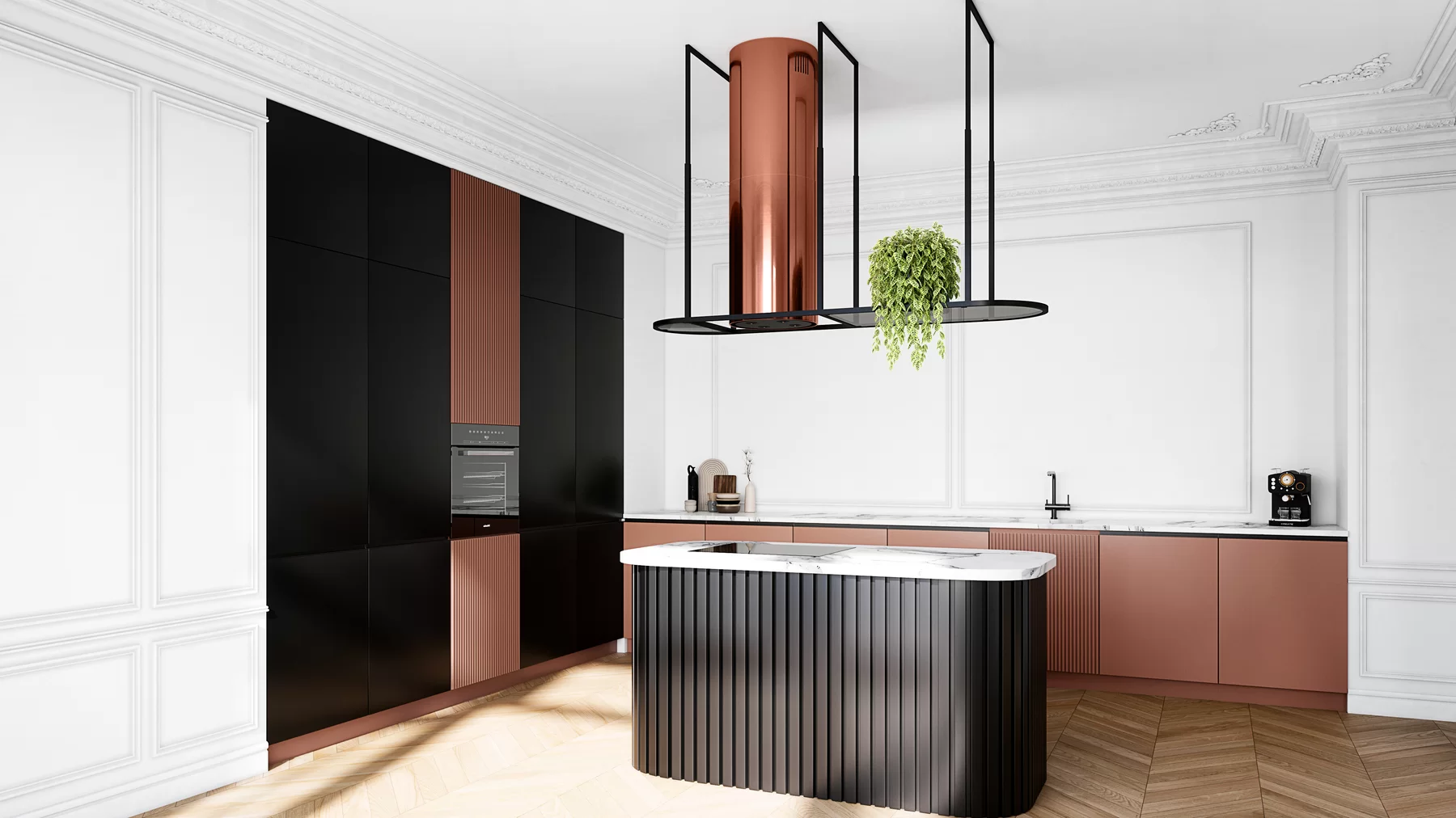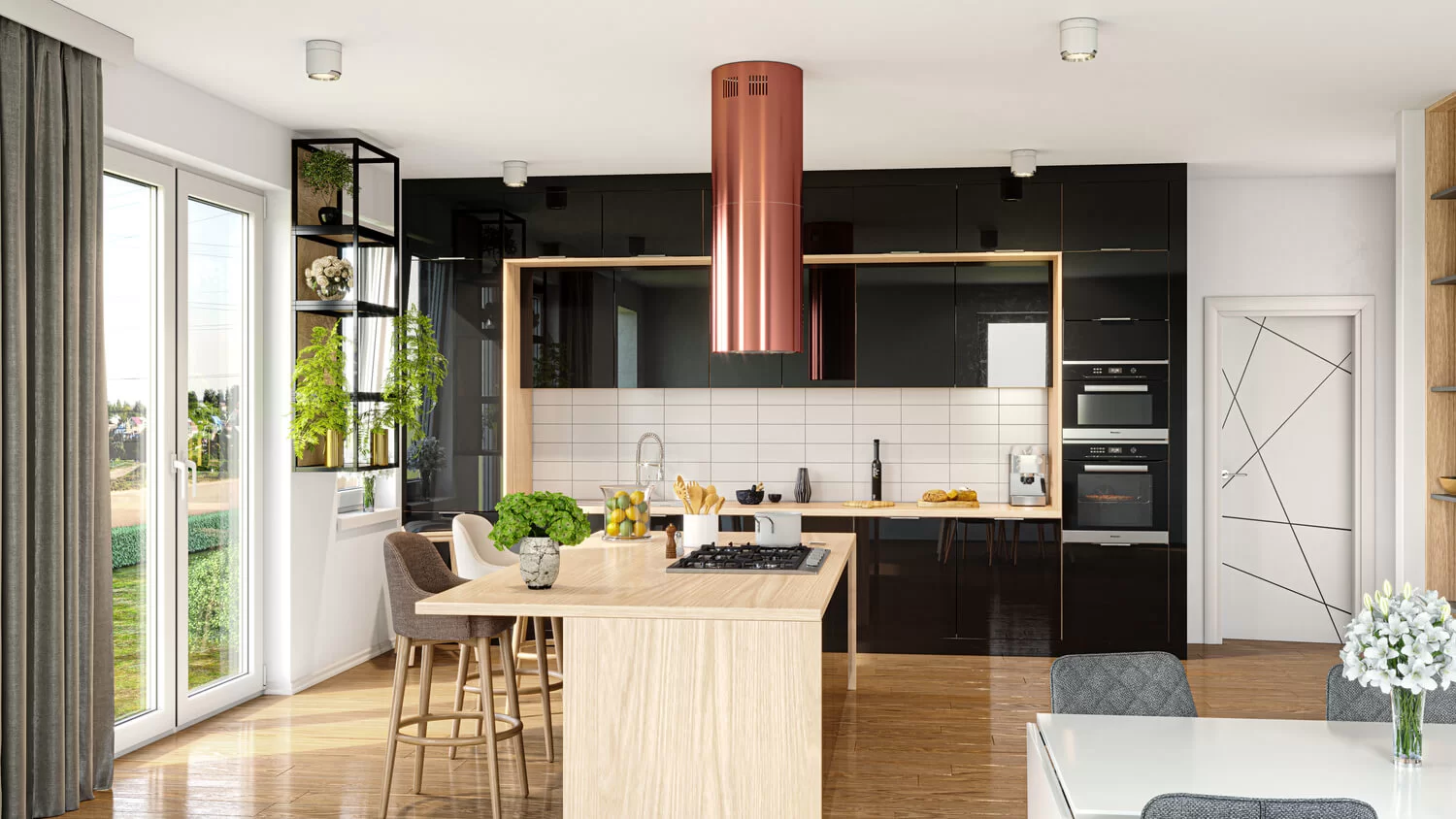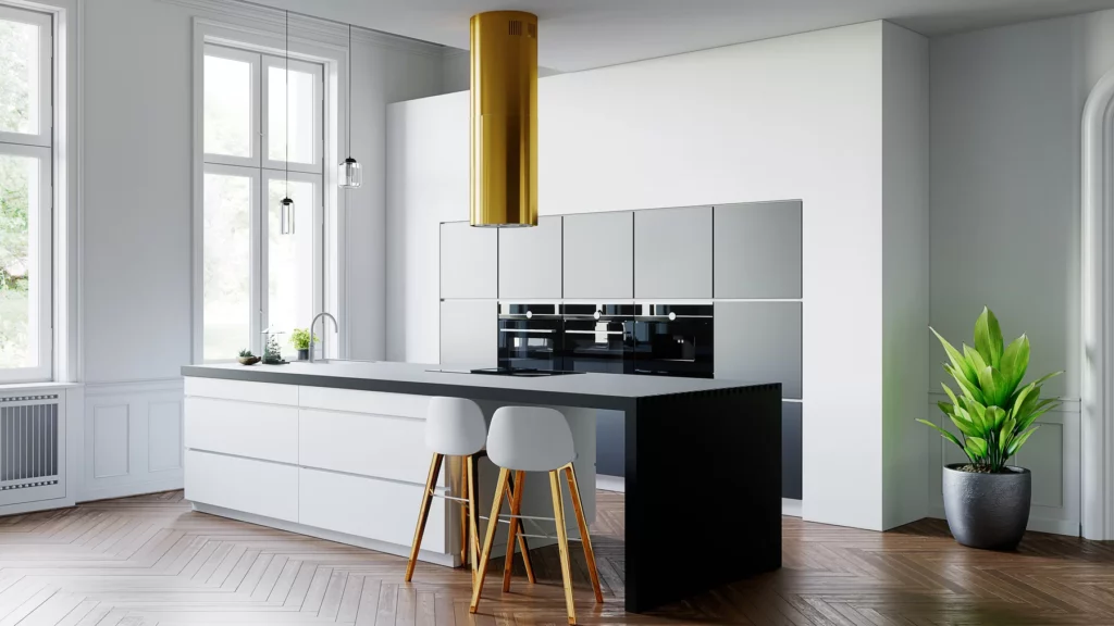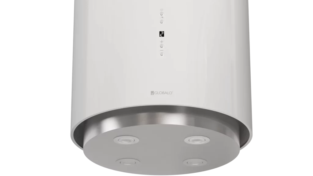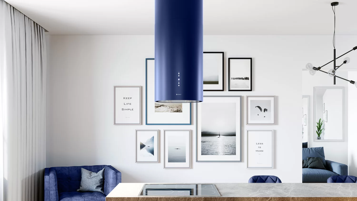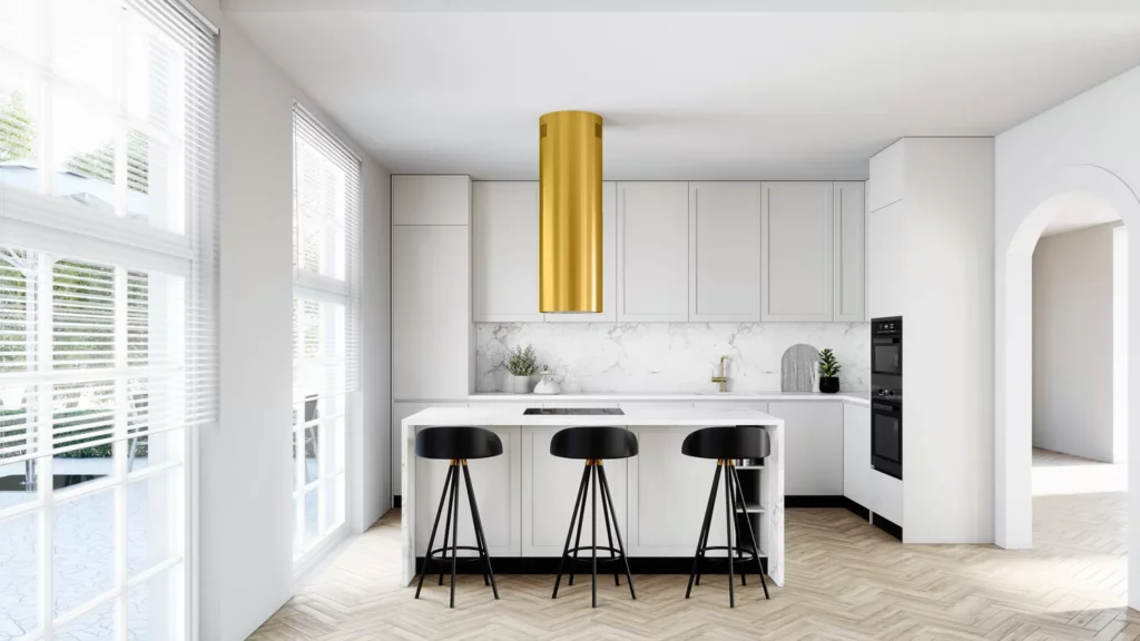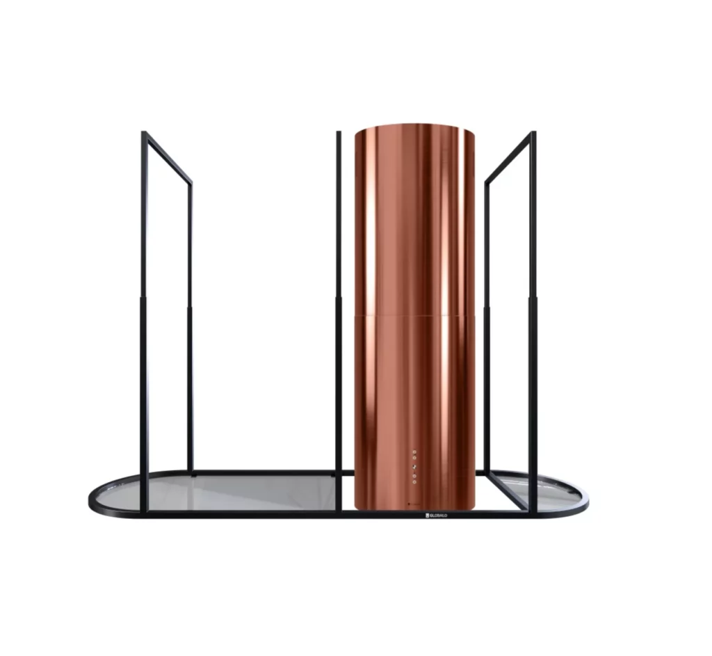 Okap bezsilnikowy w wersji wyspowej odpowiedni do połączenia z wentylatorem dachowym VILPE i działania w systemie Cichej Kuchni.