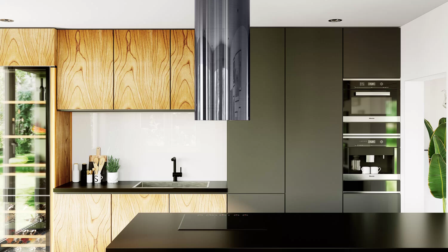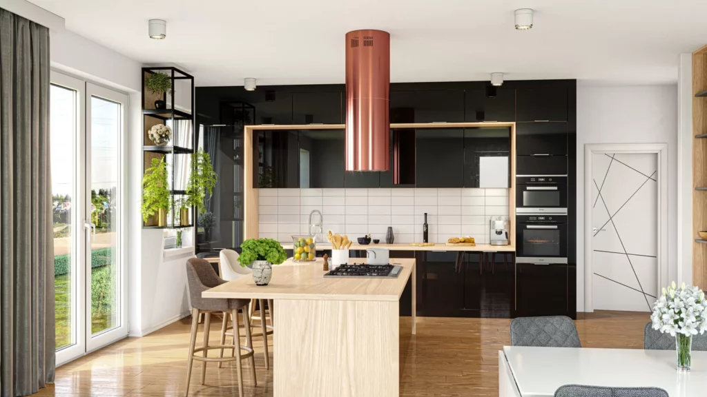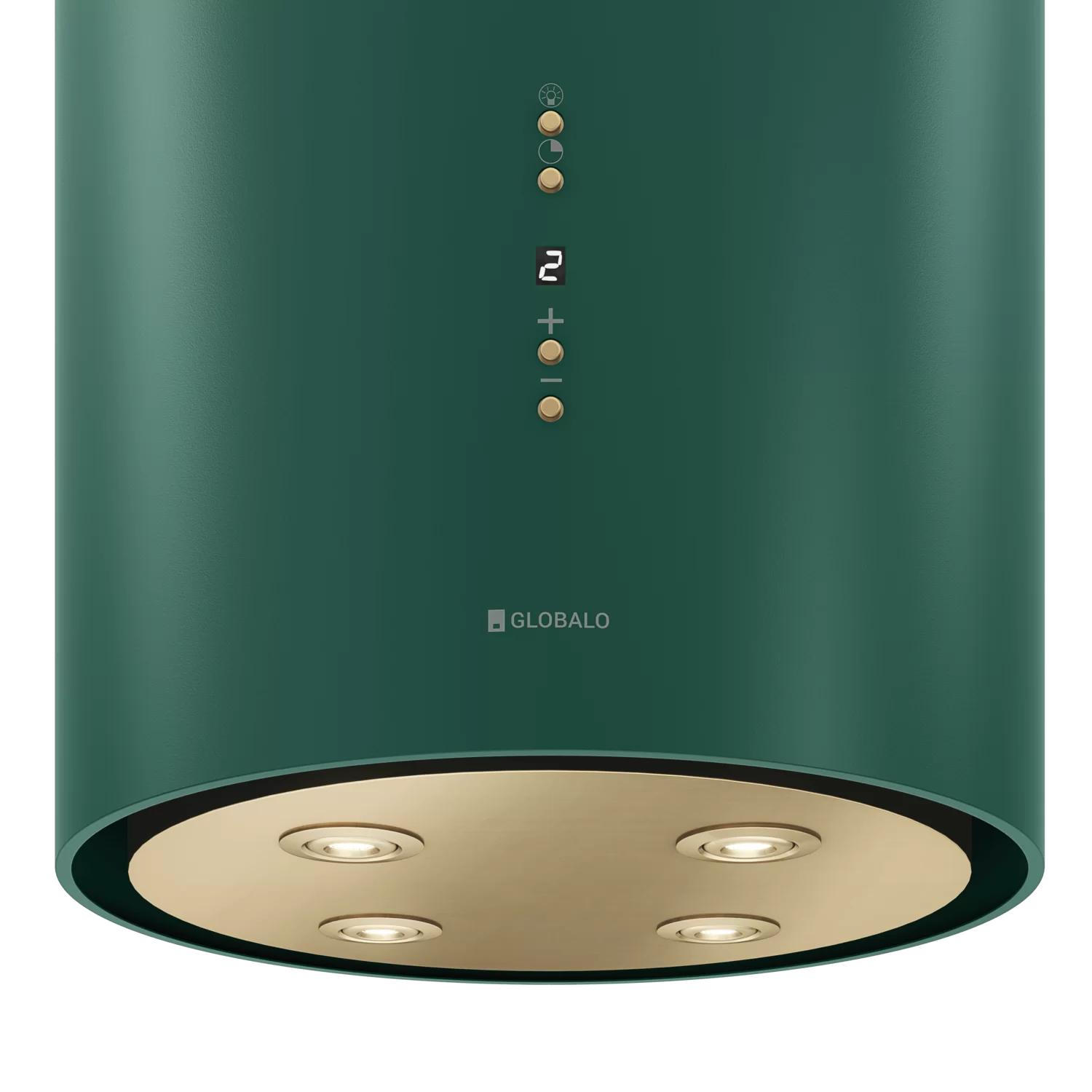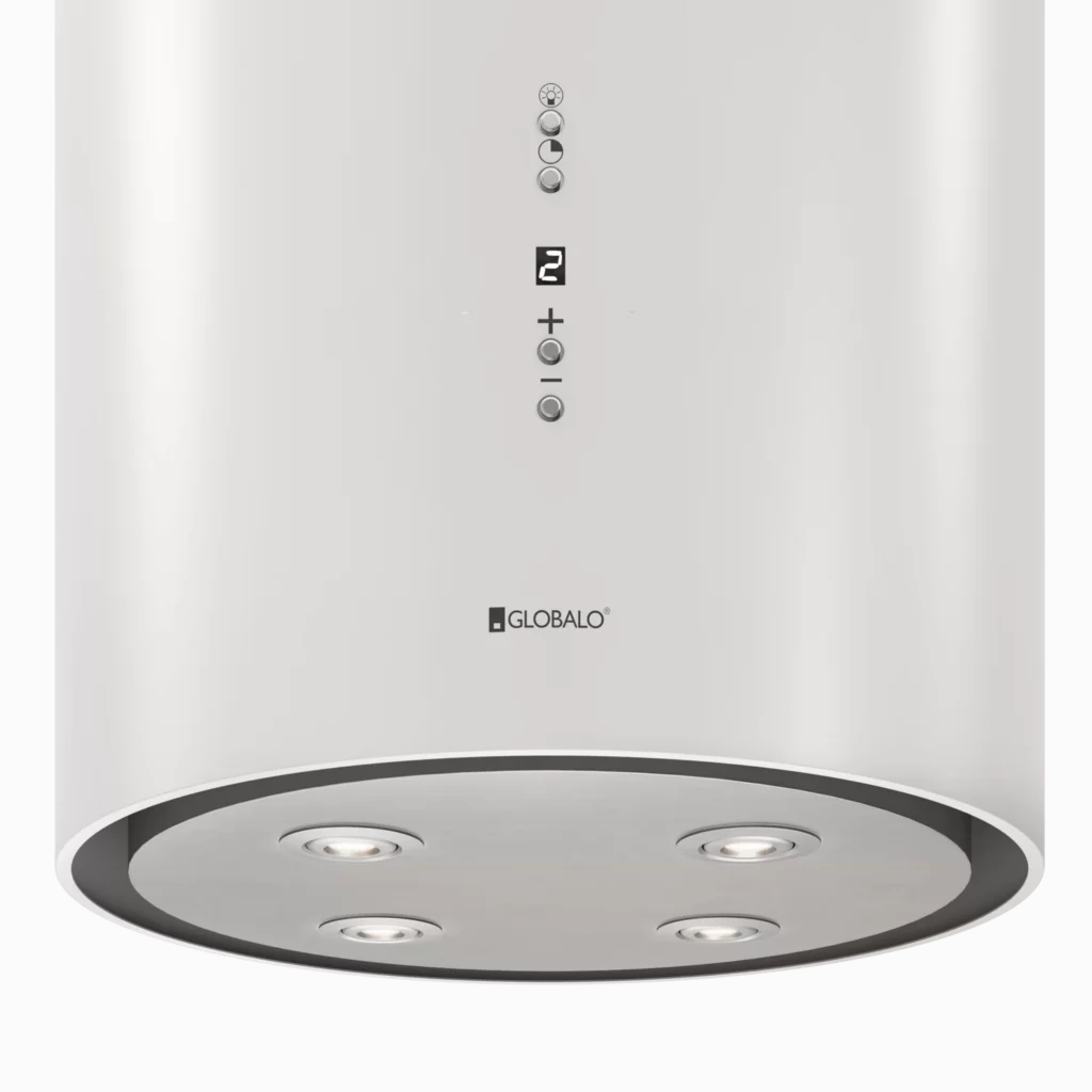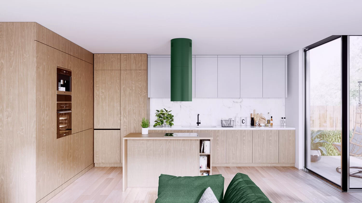Okap bezsilnikowy w wersji wyspowej odpowiedni do połączenia z wentylatorem dachowym VILPE i działania w systemie Cichej Kuchni.