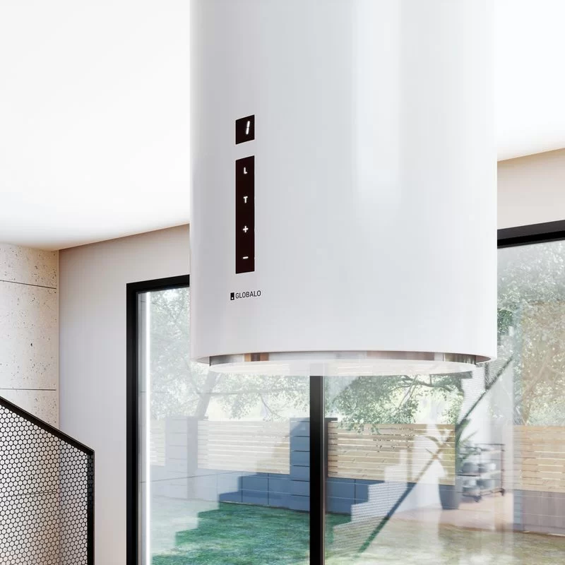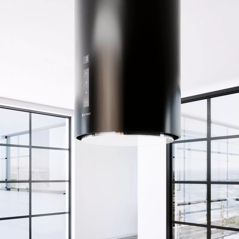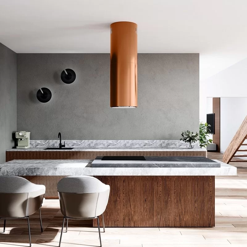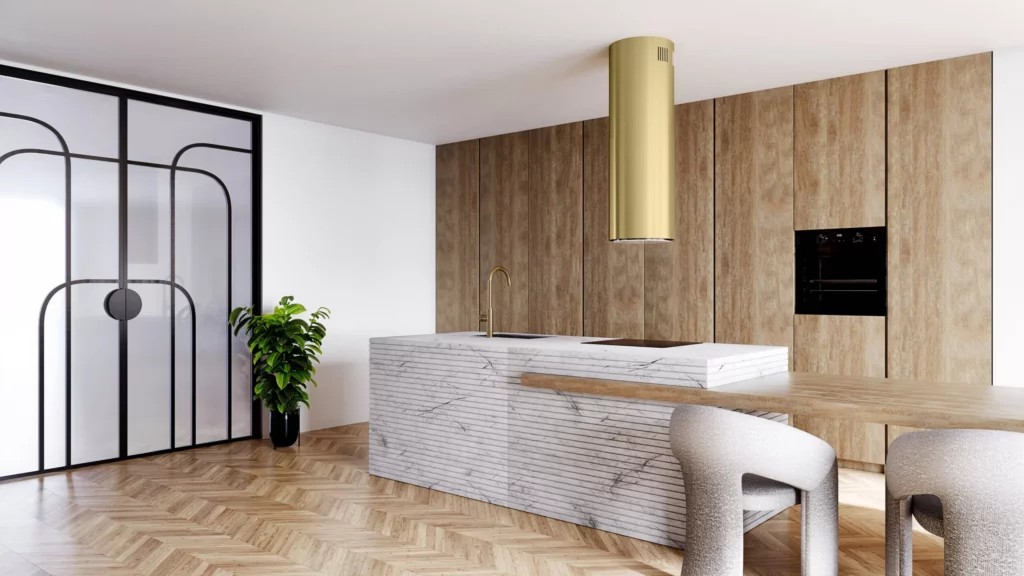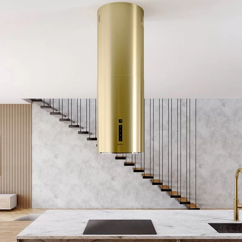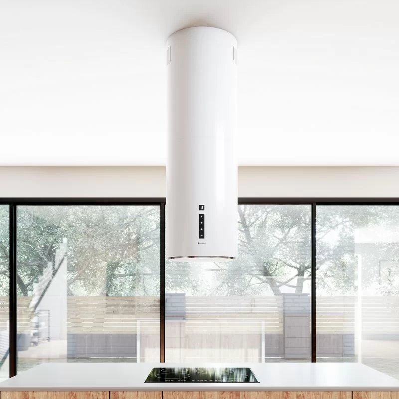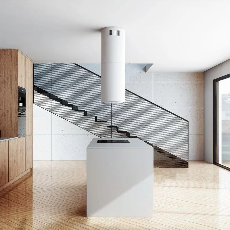 Okap bezsilnikowy w wersji wyspowej odpowiedni do połączenia z wentylatorem dachowym VILPE i działania w systemie Cichej Kuchni.