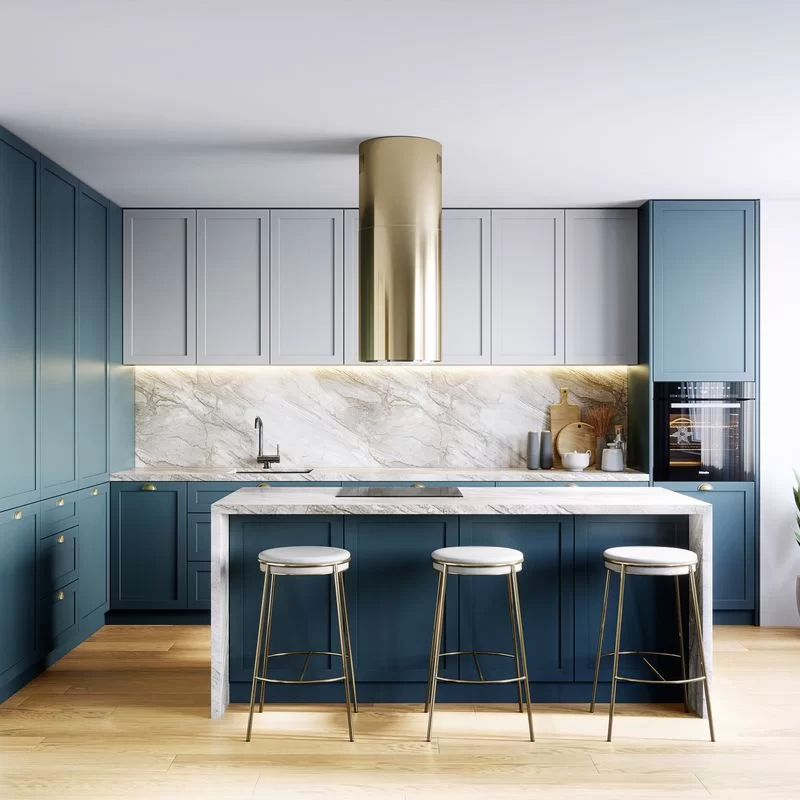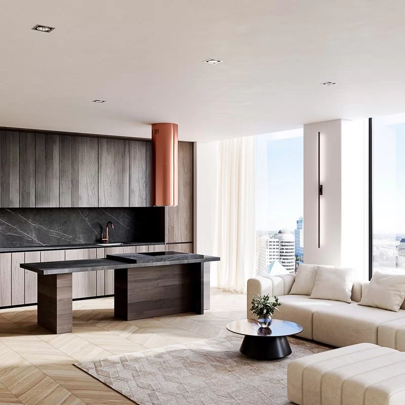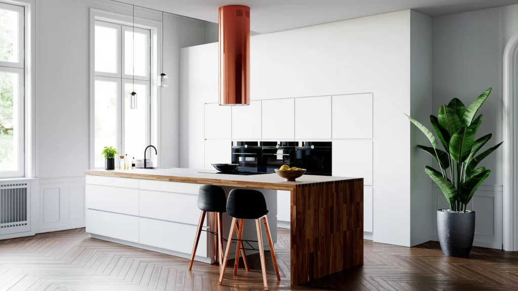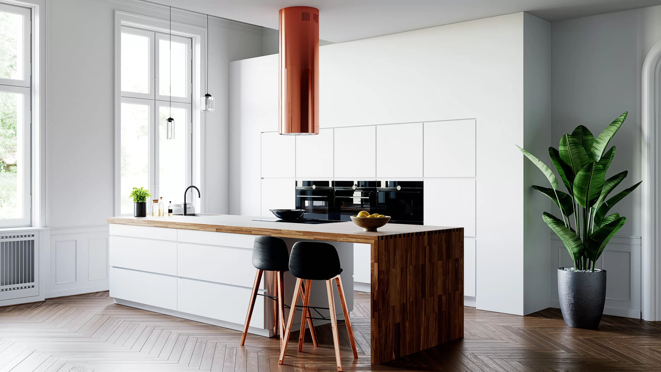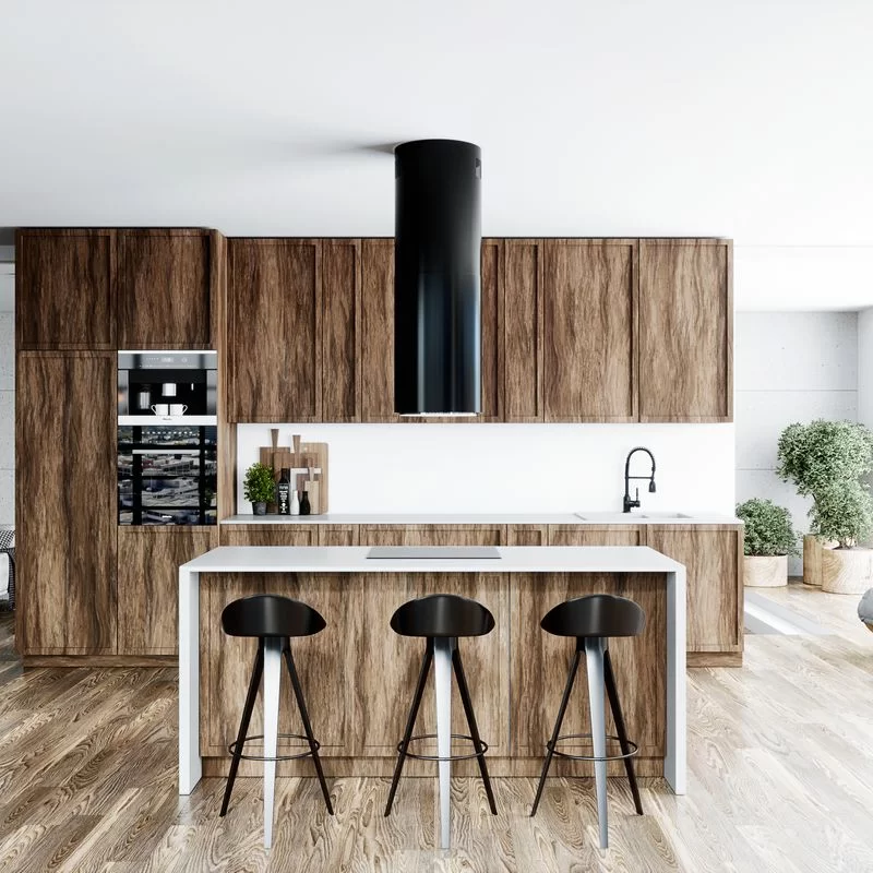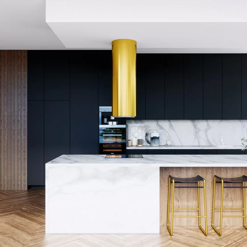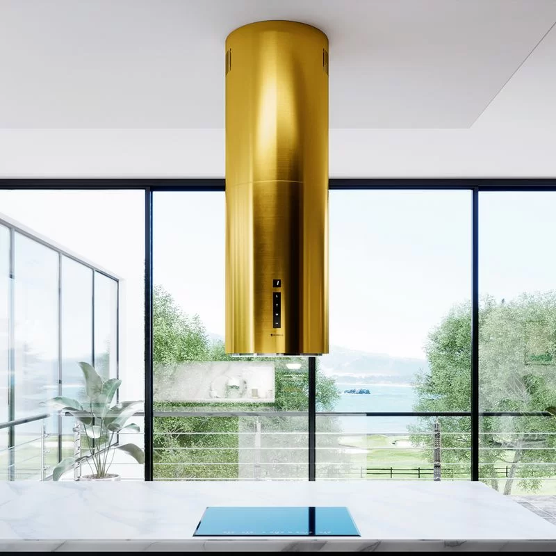 Okap bezsilnikowy w wersji wyspowej odpowiedni do połączenia z wentylatorem dachowym VILPE i działania w systemie Cichej Kuchni.