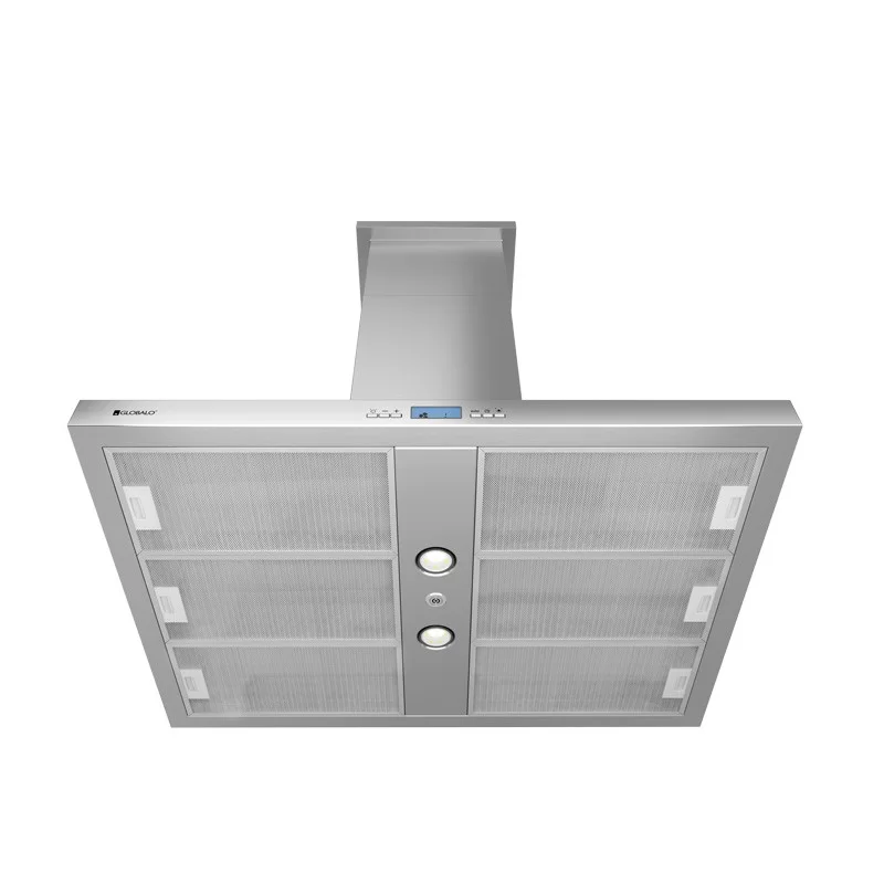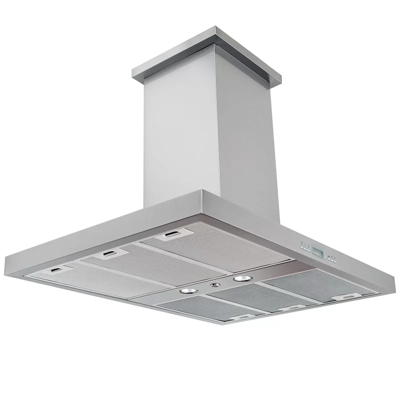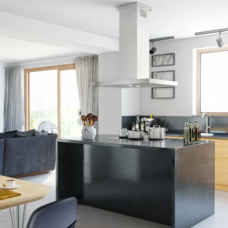Okap bezsilnikowy w wersji wyspowej odpowiedni do połączenia z wentylatorem dachowym VILPE i działania w systemie Cichej Kuchni.