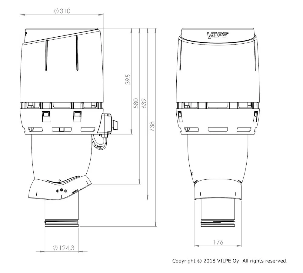 Wentylator dachowy Eco FLOW 125P/500. Wymiar: Wysokość wentylatora ponad dach około 500mm. Montaż: Przeznaczony do montażu w połaci dachu skośnego lub płaskiego.