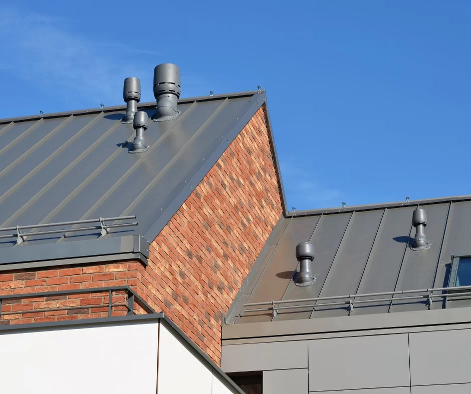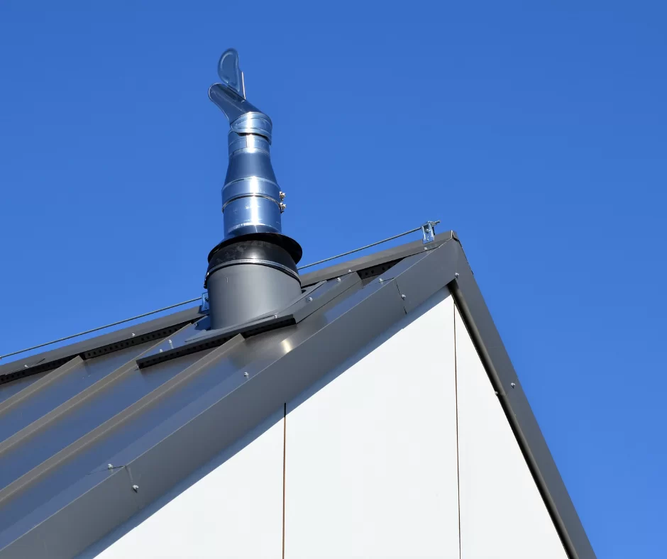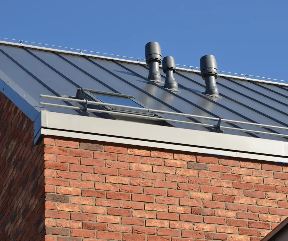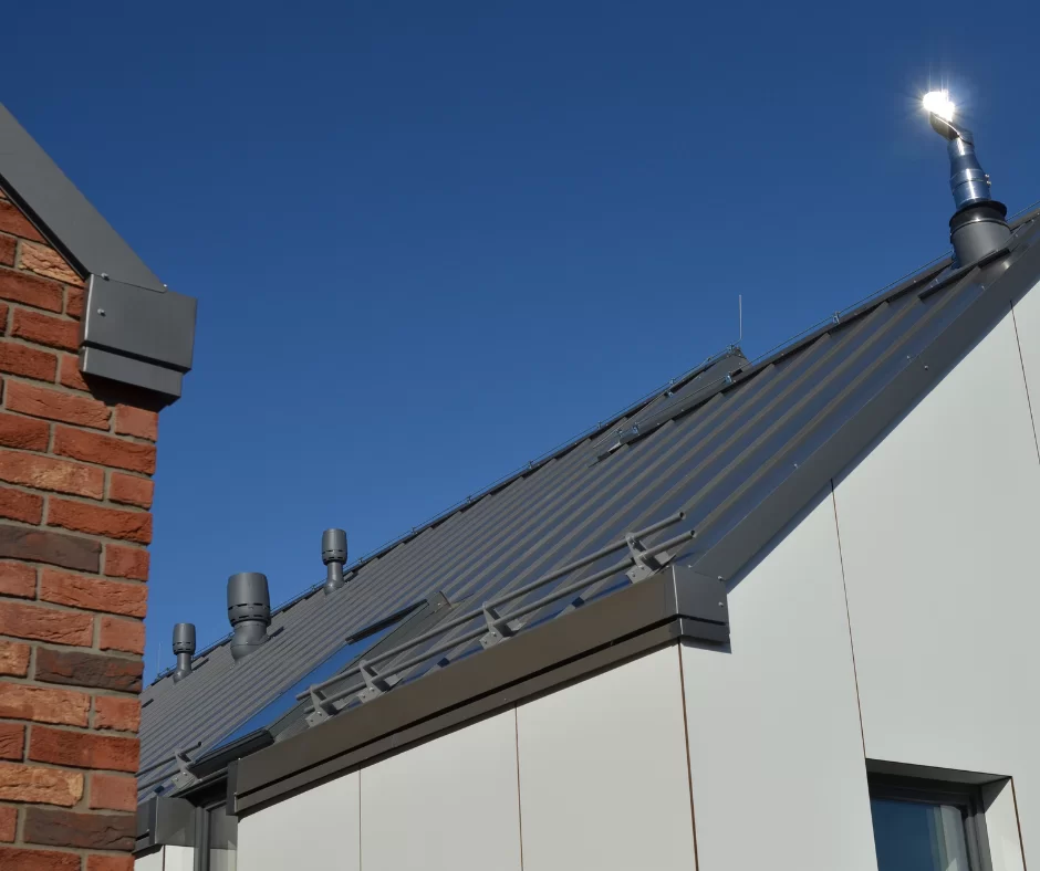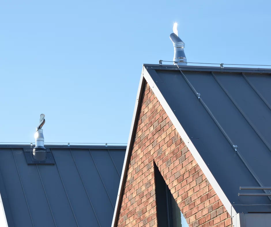 Wykorzystane materiały: Kominki wentylacyjne z serii VILPE FLOW P 110, 125, 250, uszczelnienia dachowe kominów spalinowych i kondensacyjnych