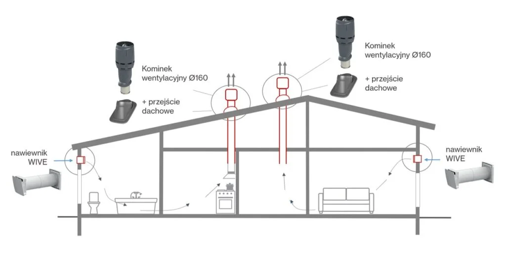 Wentylacja grawitacyjna działa na zasadzie różnicy temperatur na zewnątrz i wewnątrz domu oraz wytworzonej różnicy ciśnień.
